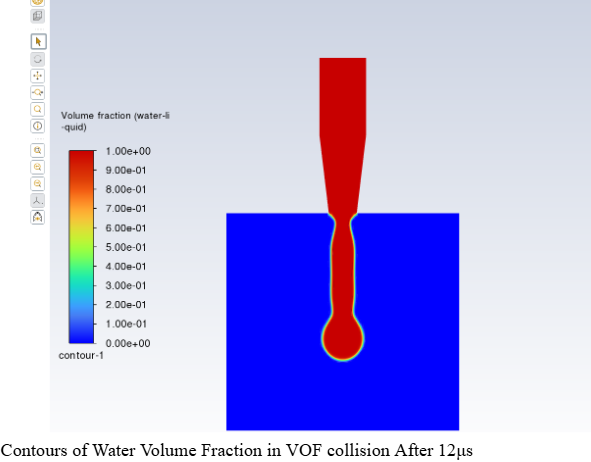 1.00.0 (default)175° (non-wetting / strongly hydrophobic)90° (default / neutral wetting)I initialized the domain with air and patched the nozzle region with liquid by setting the volume fraction to one. I used small time steps to resolve rapid interface motion during droplet ejection and wall impact.